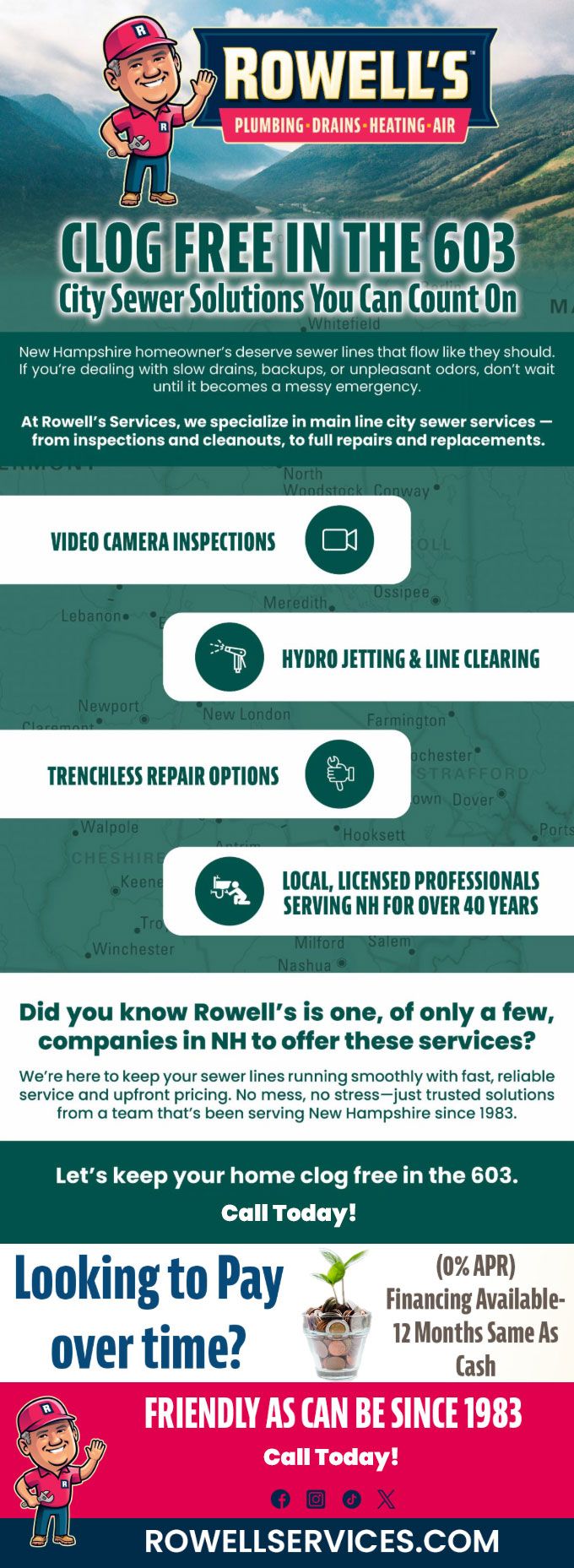 We're here to keep your sewer lines running smoothly with fast, reliable service and upfront pricing. No mess, no stress—just trusted solutions from a team that's been serving Tuftonboro since 1983.